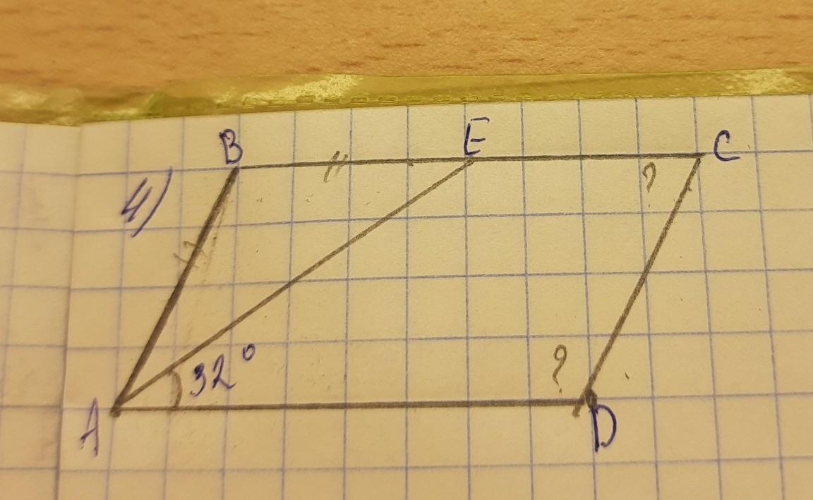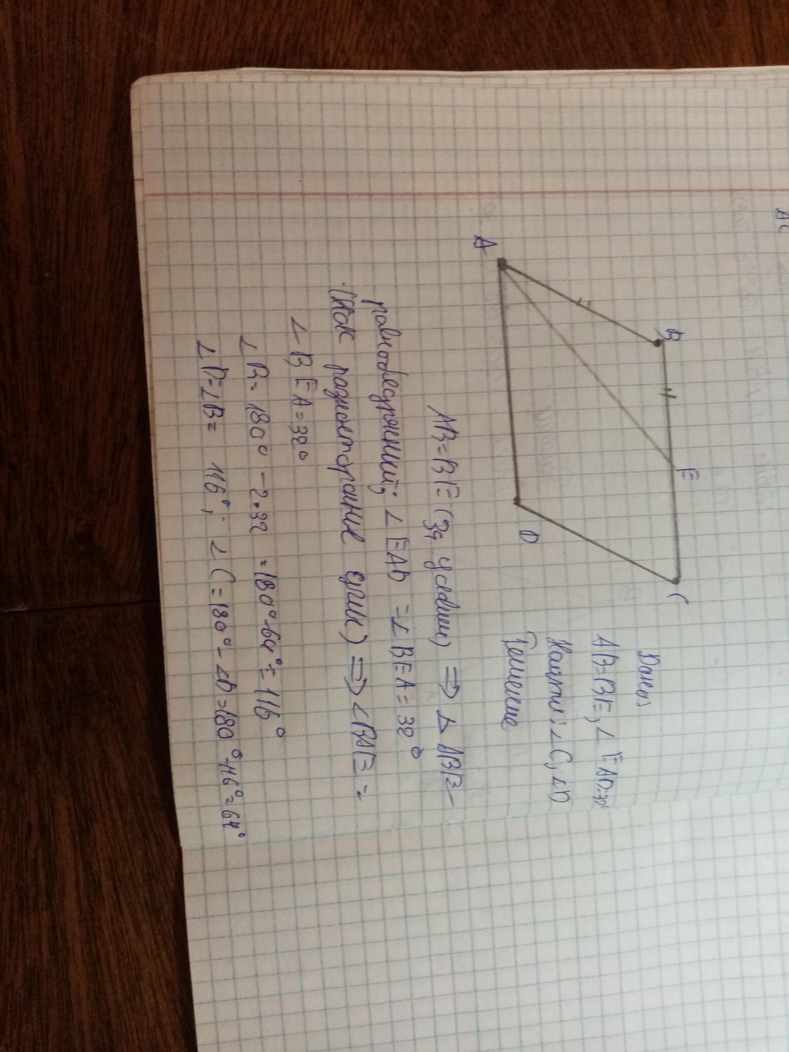 если АВ=ВЕ, то АВЕ-равнобедренный, тогда накрест лежащие углы EAD=BEA=BAE, значит АЕ-биссектриса и угол А=2*32=64