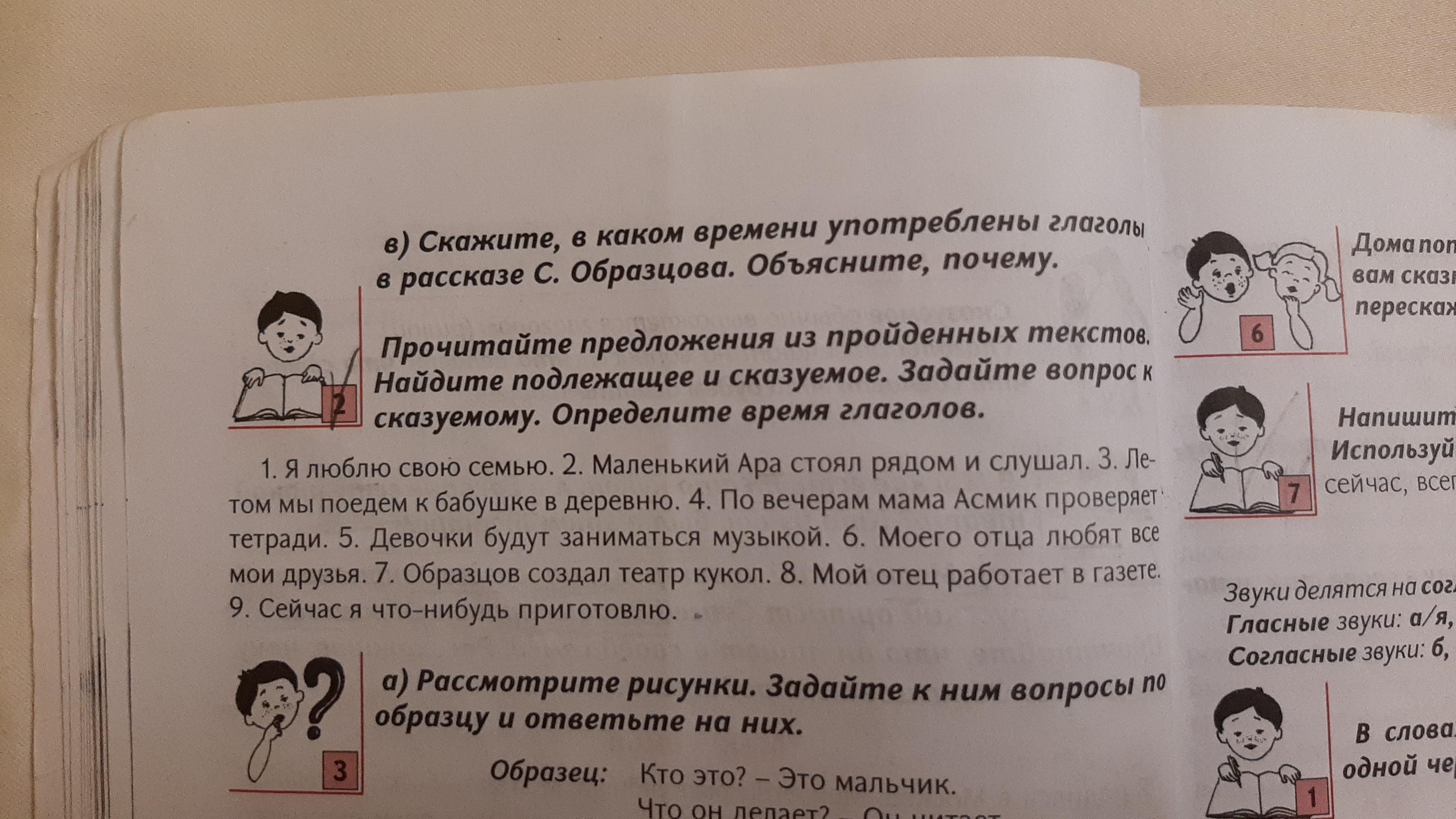 Прочитайте предложения из пройденных текстов. Найдите подлежащее и сказуемое. Задайте вопрос к сказуемому. Определите время глаголов.