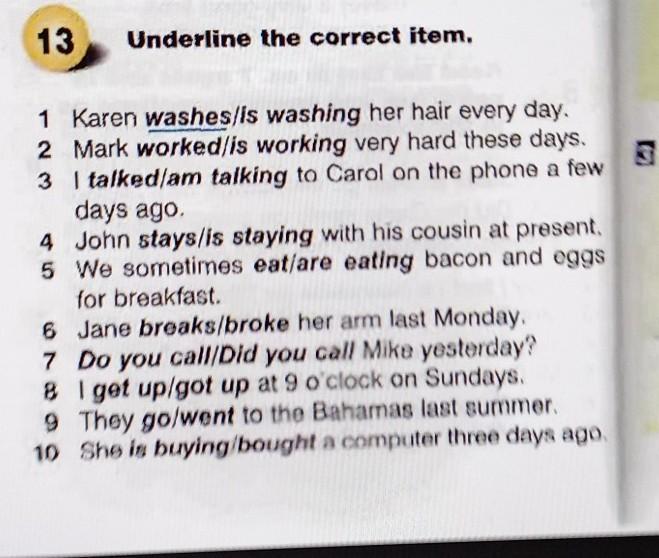 13 Underline the correct item. 1 Karen washes/is washing her hair every day, 2 Mark worked is working very hard these days. 3 I talked/am talking to Carol on the phone a few days ago. 4 John stayslis staying with his cousin at present. 5 We sometimes eat)are eating bacon and eggs for breakfast. 6 Jane breaks/broke her am last Monday. 7 Do you call/Did you call Mike yesterday? 8 I get up/got up at 9 o'clock on Sundays. 9 They golwent to tñe Bahamas last summer. 10 She is buying bought a computer three days ago.