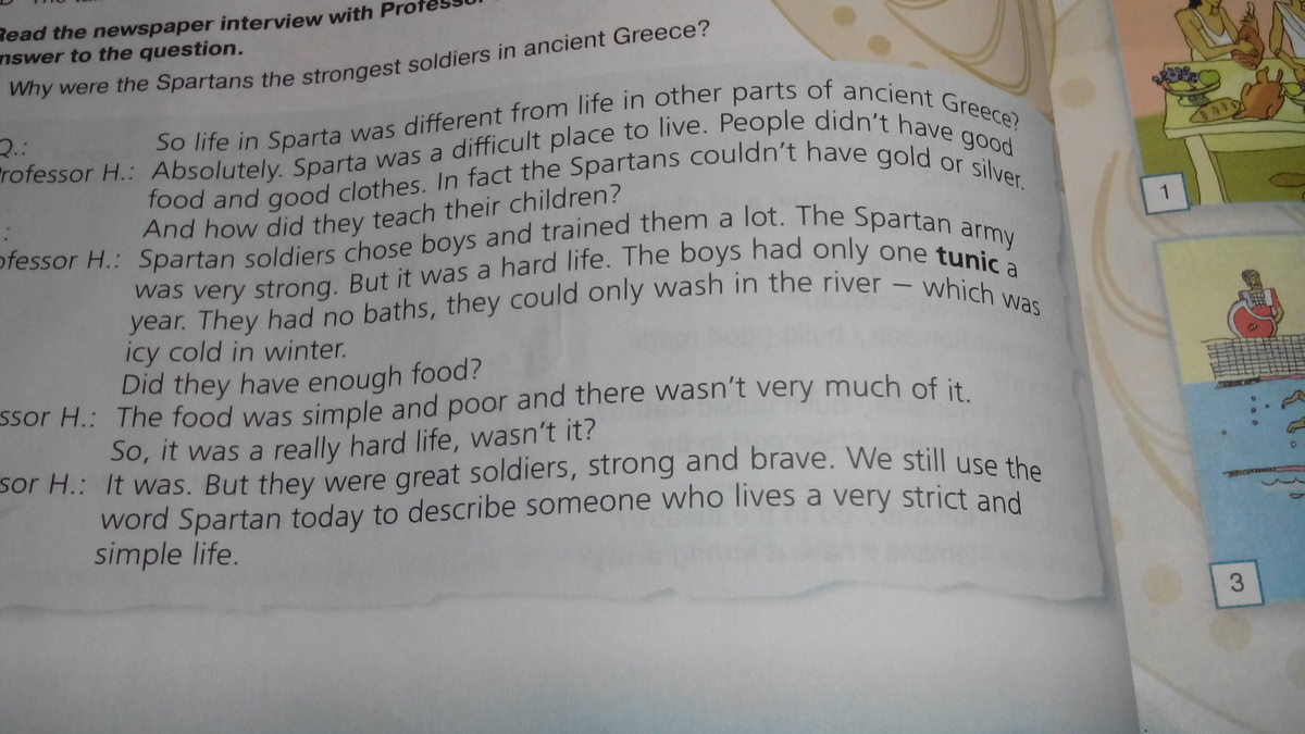 Спартанские воины отбирали мальчиков и много тренировали их. Спартанская армия была очень сильная. Но это была трудная жизнь. Мальчики имели только одну тунику на год. Они не принимали ванну. они могли только мыться в реке - которая зимой была ледяная.