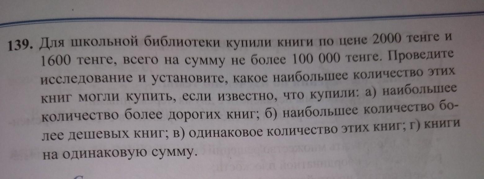 139. Для школьной библиотеки купили книги по цене 2000 тенге и 1600 тенге, всего на сумму не более 100 000 тенге. Проведите исследование и установите, какое наибольшее количество этих Книг могли купить, если известно, что купили: а) наибольшее количество более дорогих книгб) наибольшее количество бо- лее дешевых книг; В) одинаковое количество этих книг; г) книги на одинаковую сумму.