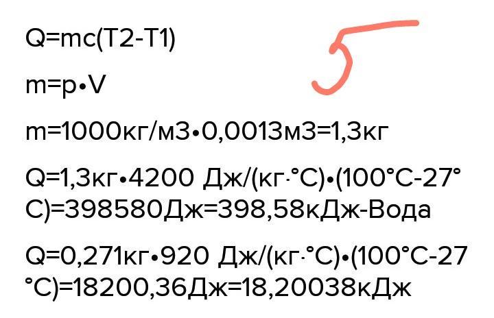 Определи, какое количество теплоты получили алюминиевая кастрюля массой 254 г и находящаяся в ней вода объёмом 1,4 л при нагревании от 25°C до кипения при температуре 100°C. Удельная теплоёмкость алюминия равна 920 Дж/(кг·°C), удельная теплоёмкость воды — 4200 Дж/(кг·°C), плотность воды — 1000 кг/м³.