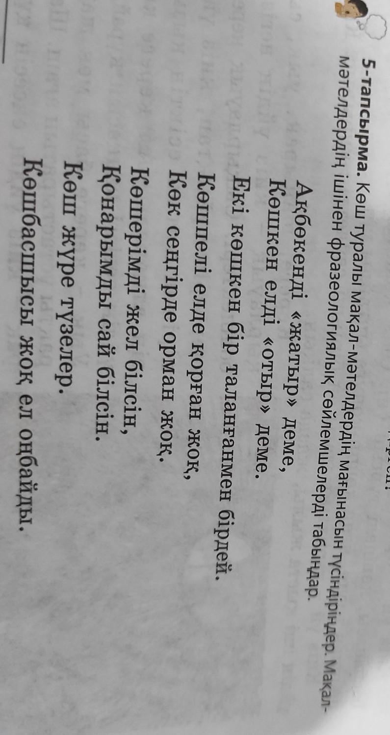 5-тапсырма. Көш туралы мақал-мәтелдердің мағынасын түсіндіріңдер. Мақал- мәтелдердің ішінен фразеологиялық сөйлемшелерді табыңдар. Ақбөкенді «жатыр» деме, Көшкен елді «отыр» деме. Екі көшкен бір таланғанмен бірдей. Көшпелі елде қорған жоқ, Көк сеңгірде орман жоқ. Көшерімді жел білсін, Қонарымды сай білсін. Көш жүре түзелер. Көшбасшысы жоқ ел оңбайды.