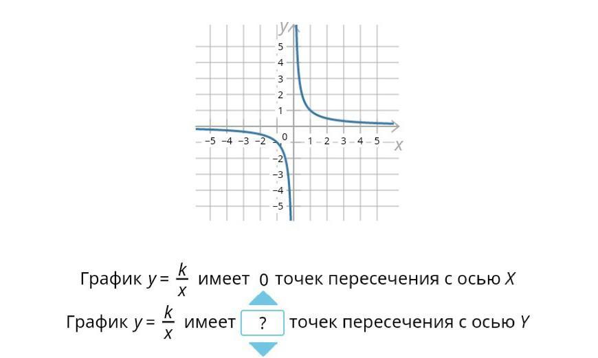 График функции у = k/x не имеет ни одной точки пересечения с осью Y. Ось Y пересекается, когда значение х равно 0. В данном случае х не может быть равен 0, т.к. он в знаменателе, а на нуль делить нельзя.