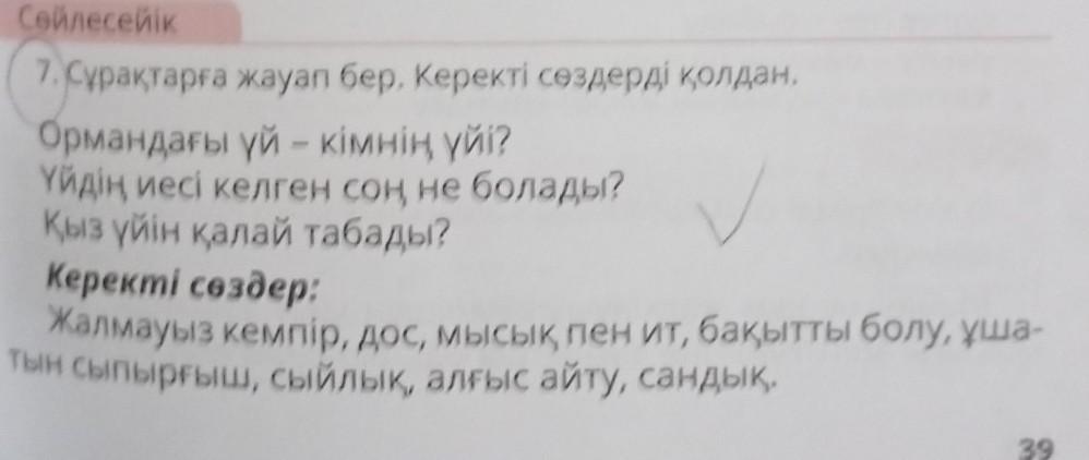 Сөйлесейік 7. Сұрақтарға жауап бер. Керекті сөздерді қолдан Ормандағы үй - кімнің үйі? Үйдің иесі келген соң не болады? Қыз үйін қалай табады? Керекті сөздер: Жалмауыз кемпір, дос, мысық пен ит, бақытты болу, ұша- тын сыпырғыш, сыйлық, алғыс айту, сандық,