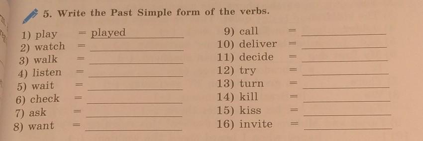 ко всем словам добавляй оканчание "ed" watched ,walked,listened, waited,checked,asked,wanted,called,delivered, tryed, turned,killesd,kisset,invited.