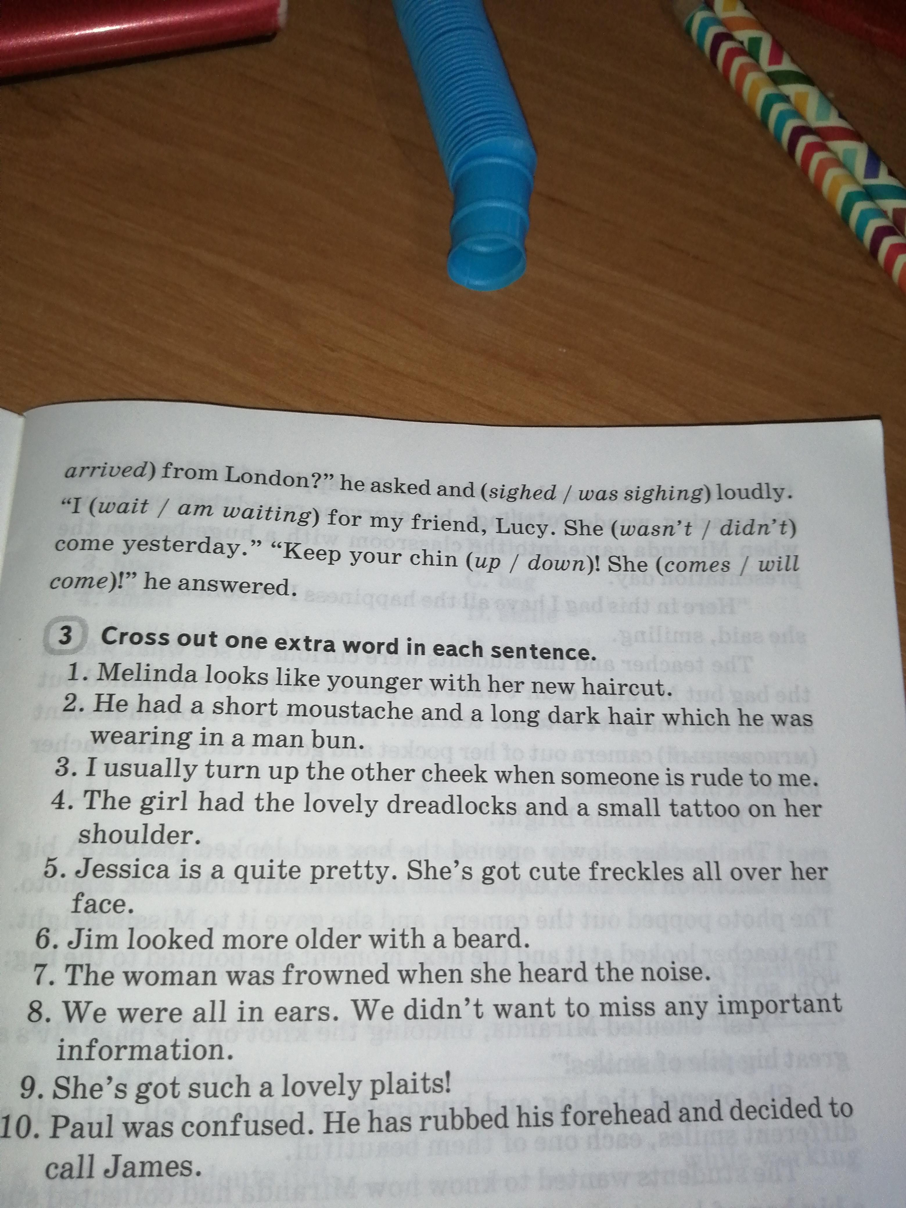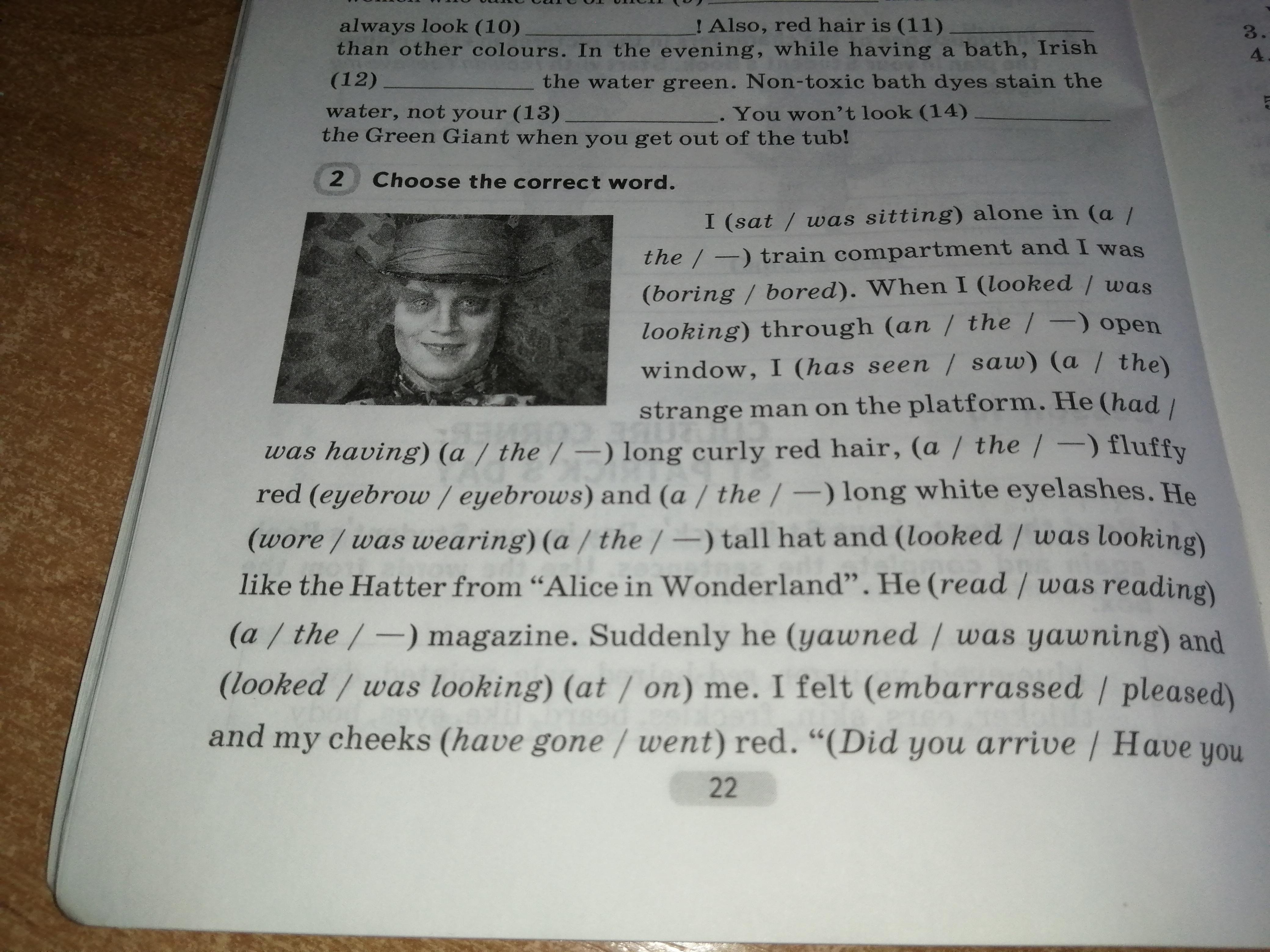 was sitting, a, bored, looked, the, saw, a, had, -, -, eyebrows, -, was wearing, a, looked, was reading, a, yawned, looked, at, embarrassed, went, did you arrive, sighed, am waiting, didn't, up, will come