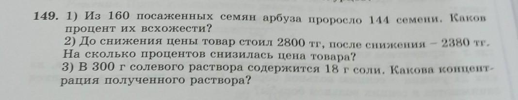 1) Иа 160 посаженных семян арбуза проросло 144 семени. 2) До снижения цены товар стоил 2800 тг, после снижения - 2 3) В 300 г солевого раствора содержится 18 г соли. Какова или рация полученного раствора? На сколько процентов снизилась цена товара? мне только первое