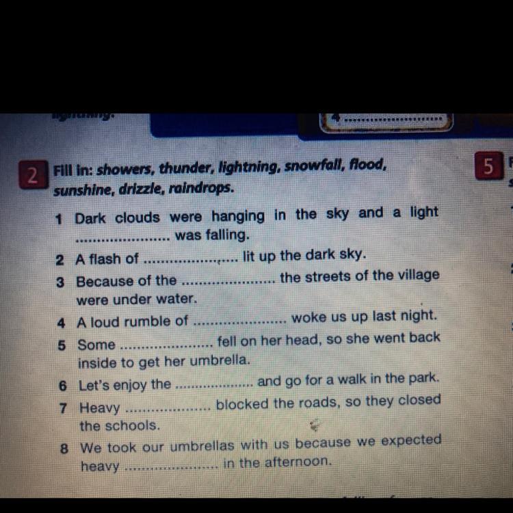 Fill in: showers, thunder, lightning, snowfall, flood,