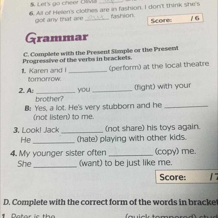 1 are performing 2 Do… fight …….doesn’t listen 3 isn’t sharing ….hates 4 copies …wants