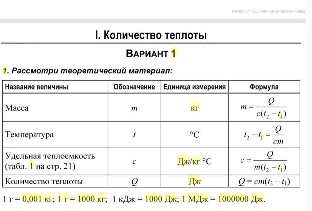 1. Количество теплоты ВАРИАНТ 1 1. Рассмотри теоретический материал: Назвахме величины 0003NAYONNE ENN Wa Mapens Формула Macca Kr Температура 1 Дж/кг °C Удельная теплоемкость (табл. 1 на стр. 21) Количество теплоты g 1 г = 0,001 кг; 1 т = 1000 кг; 1 кДж = 1000 Дж; І МДж = 1000000 Дж.(помогите пожалуйста )