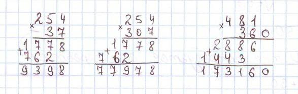 2) 254 ∙ 307 Умножу первый множитель на число единиц: 254 ∙ 7 = 1778 Получу первое неполное произведение 1778. Умножу первый множитель на число десятков: 254 ∙ 0 = 0 Получу второе неполное произведение: 0. Умножу первый множитель на число сотен: 254 ∙ 3 = 762 Получу третье неполное произведение: 762. Начну подписывать второе неполное произведение под десятками, а третье под сотнями. Сложу неполные произведения. Читаю ответ: произведение чисел 254 и 307 равно 77978.
