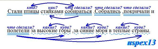 Стали птицы стайками собираться .Собрались ,покричали и полетели за высокие горы ,за синие моря в теплые страны.