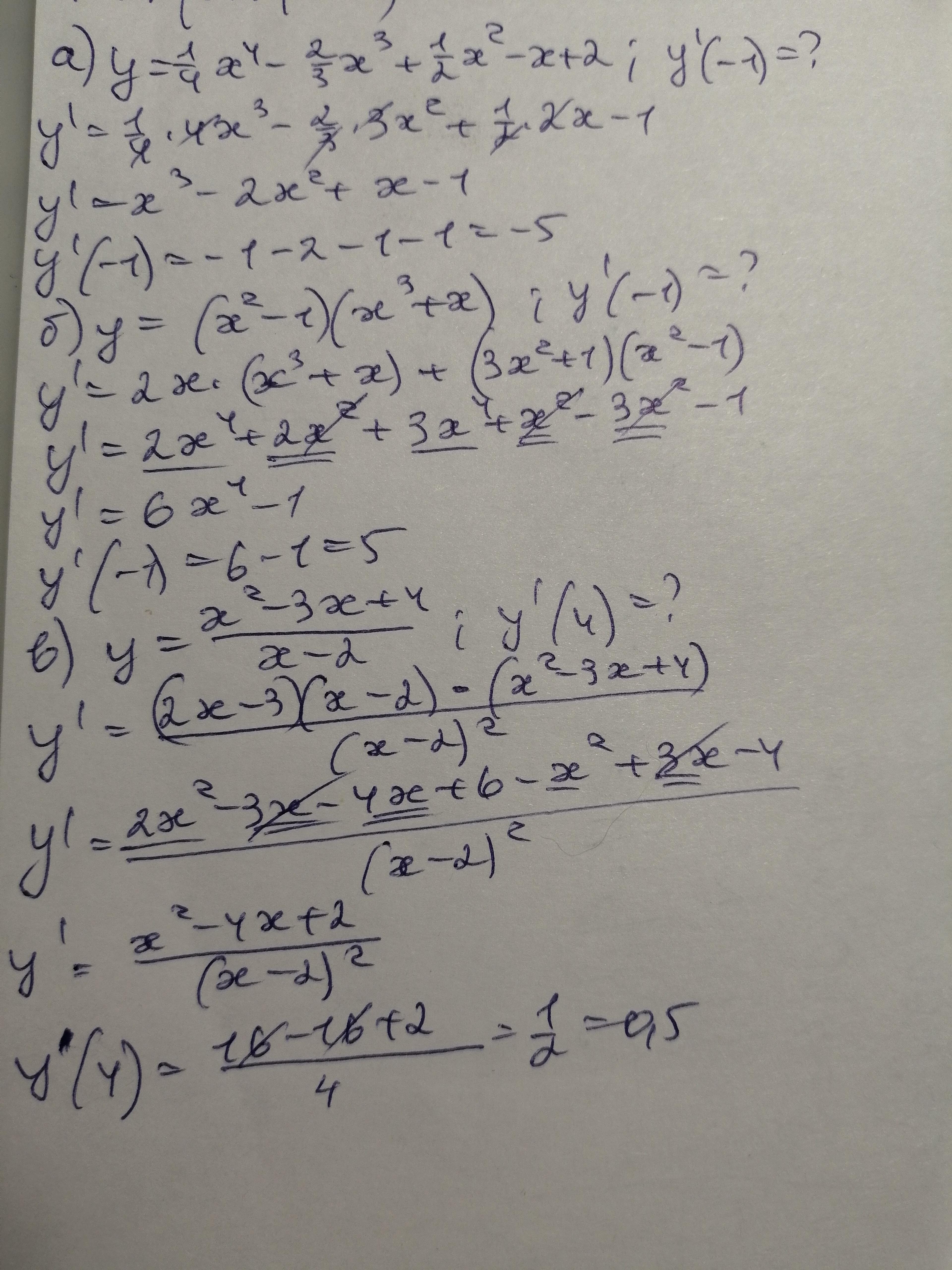 y ' = ( 1/4 x⁴ - 2/3 x³ + 1/2 x²- x + 2 ) ' = 1/4 * 4x³ - 2/3 *3x² + 1/2 *2x - 1 + 0 =