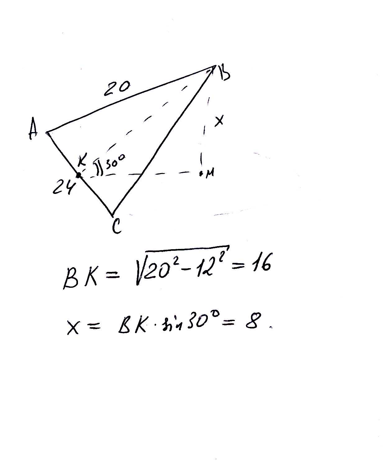 Основание АС равнобедренного треугольника лежит в плоскости альфа. Найти расстояние от точки В до плоскости альфа, если АВ=20см, АС=24 см, а двугранный угол между плоскостями АВС и альфа равен 30 градусам.