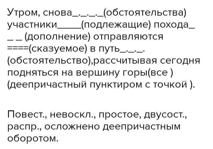 Утром участники похода снова отправляются в путь рассчитывая подняться на вершину горы члены предоложения подчеркните