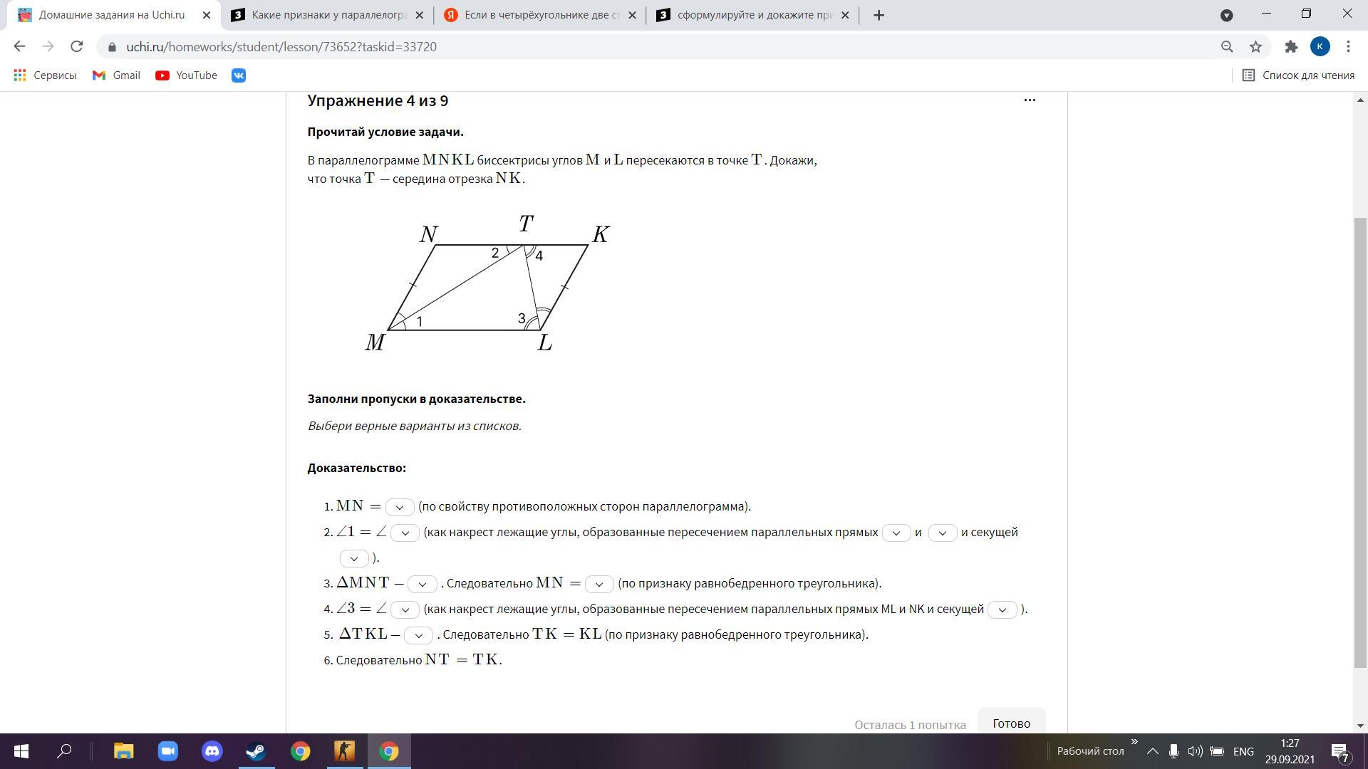 <1 = <2, параллельные прямые NK и ML и секущая МТ
