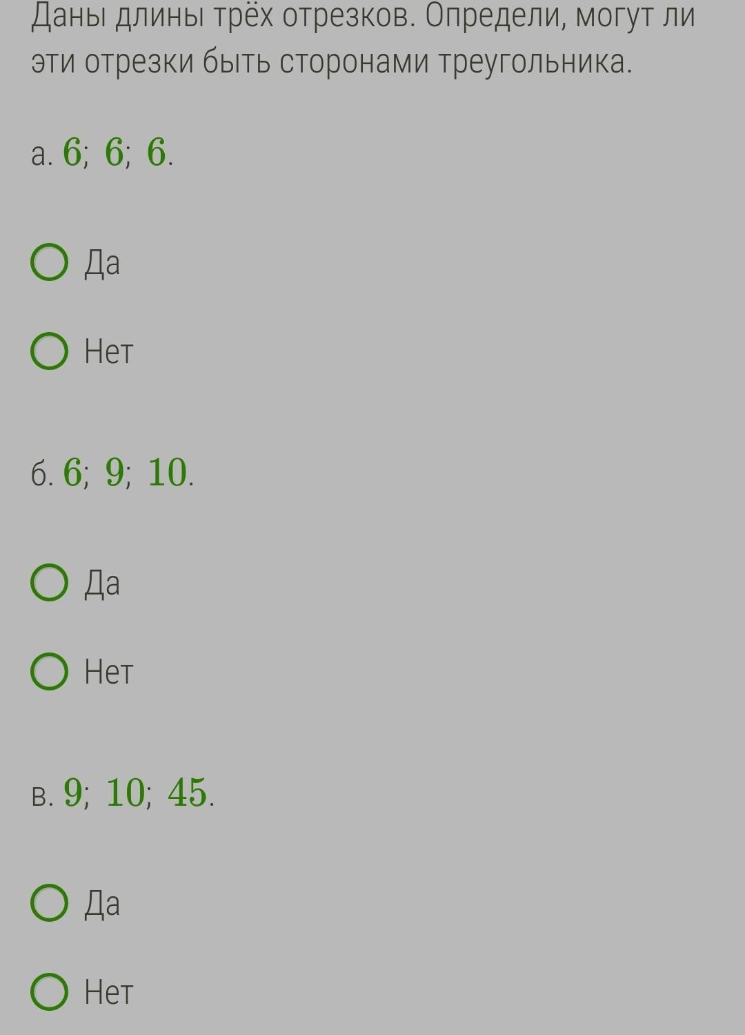 даны длины трёх отрезков.Определи,могут ли эти отрезки быть сторонами треугольника. Срочно!!