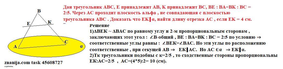 Дан треугольник ABC, E принадлежит AB, K принадлежит BC, BE : BA=BK : BC = 2:5. Через AC проходит плоскость альфа , не совподающая с плоскостью треугольника ABC . Доказать что EK паралелен альфе, найти длинну отрезка AC , если EK = 4 см