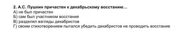 Вероятнее был не причастие хотя кенты его не раз звали на революцию. Но не так охотно, поч? Да все просто ребят Ани понимали что таааакой талант как у Пушкина нет ни у кого из них. Поэтому по итогу всех посадили, убили, казнили, поотправляли в ссылки, а тот ещё жил пару лет.)))))
