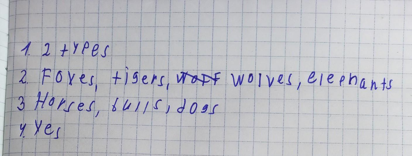 3) dogs, cats, cows, horses, bulls, sheep, hens and so on.