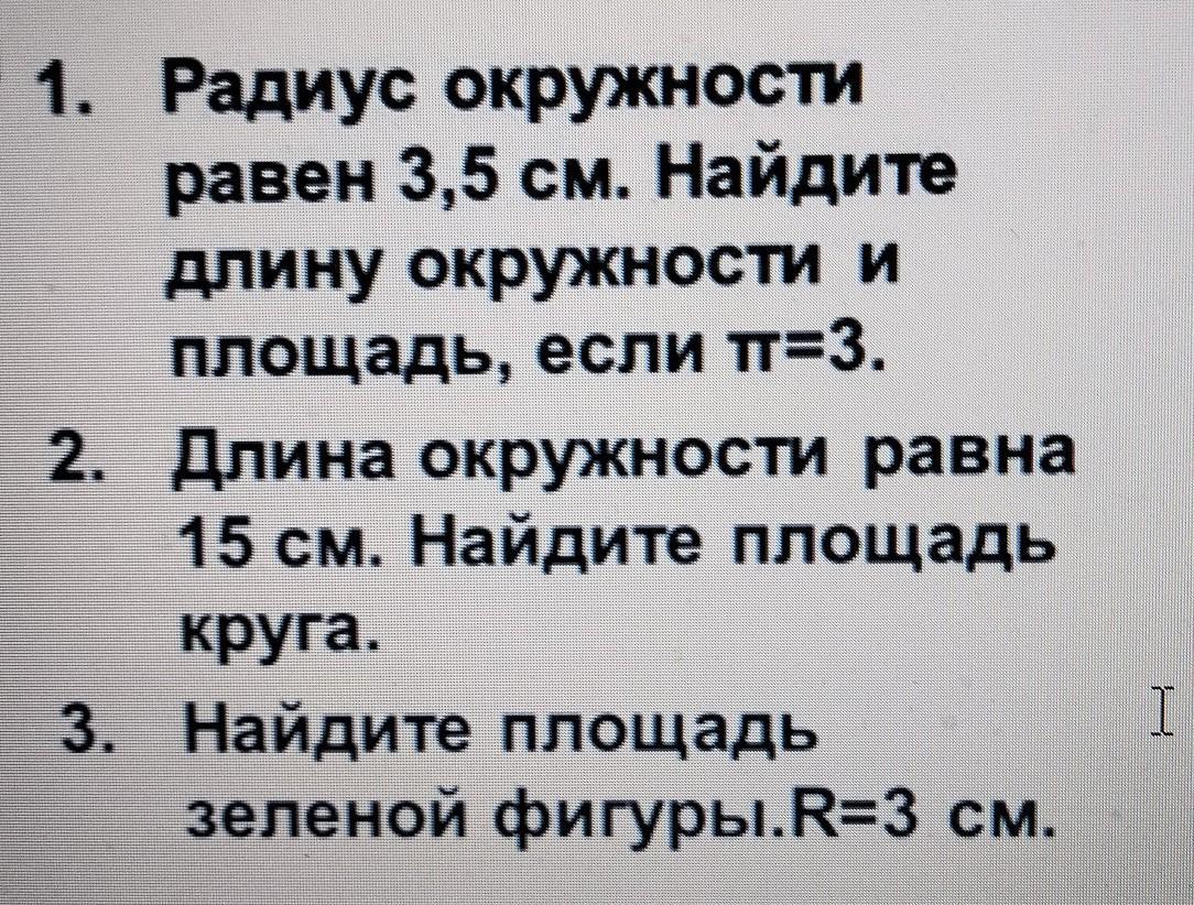 1. Радиус окружности равен 3,5 см. Найдите длину окружности и площадь, если тт=3. 2. Длина окружности равна 15 см. Найдите площадь круга. 3. Найдите площадь зеленой фигуры.R=3 см. помогите пожалуйста