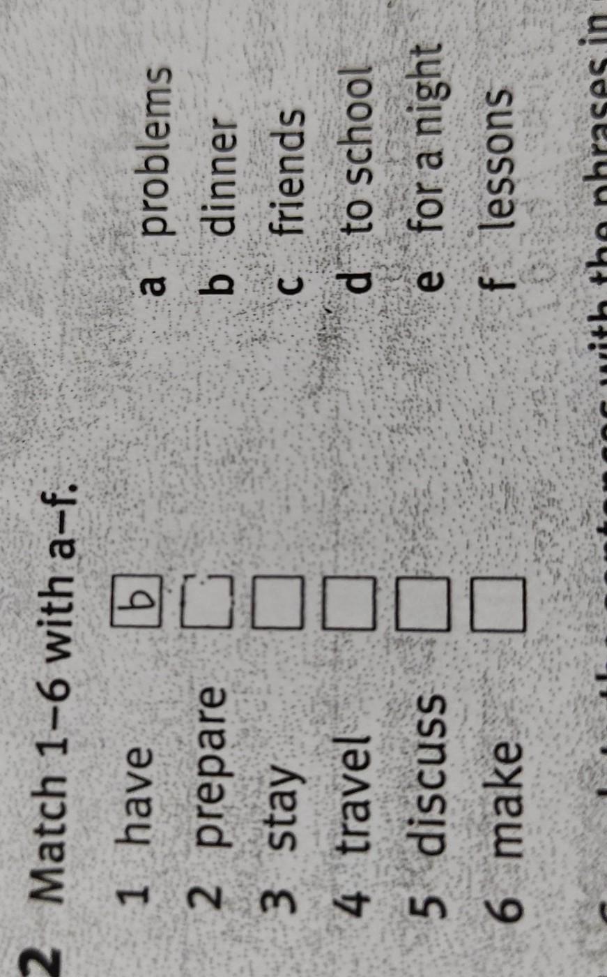 2 Match 1-6 with a-f. 1 have b 2 prepare o 3 stay 4 travel 5 discuss 6 make a problems b dinner c friends d to school e for a night f lessons