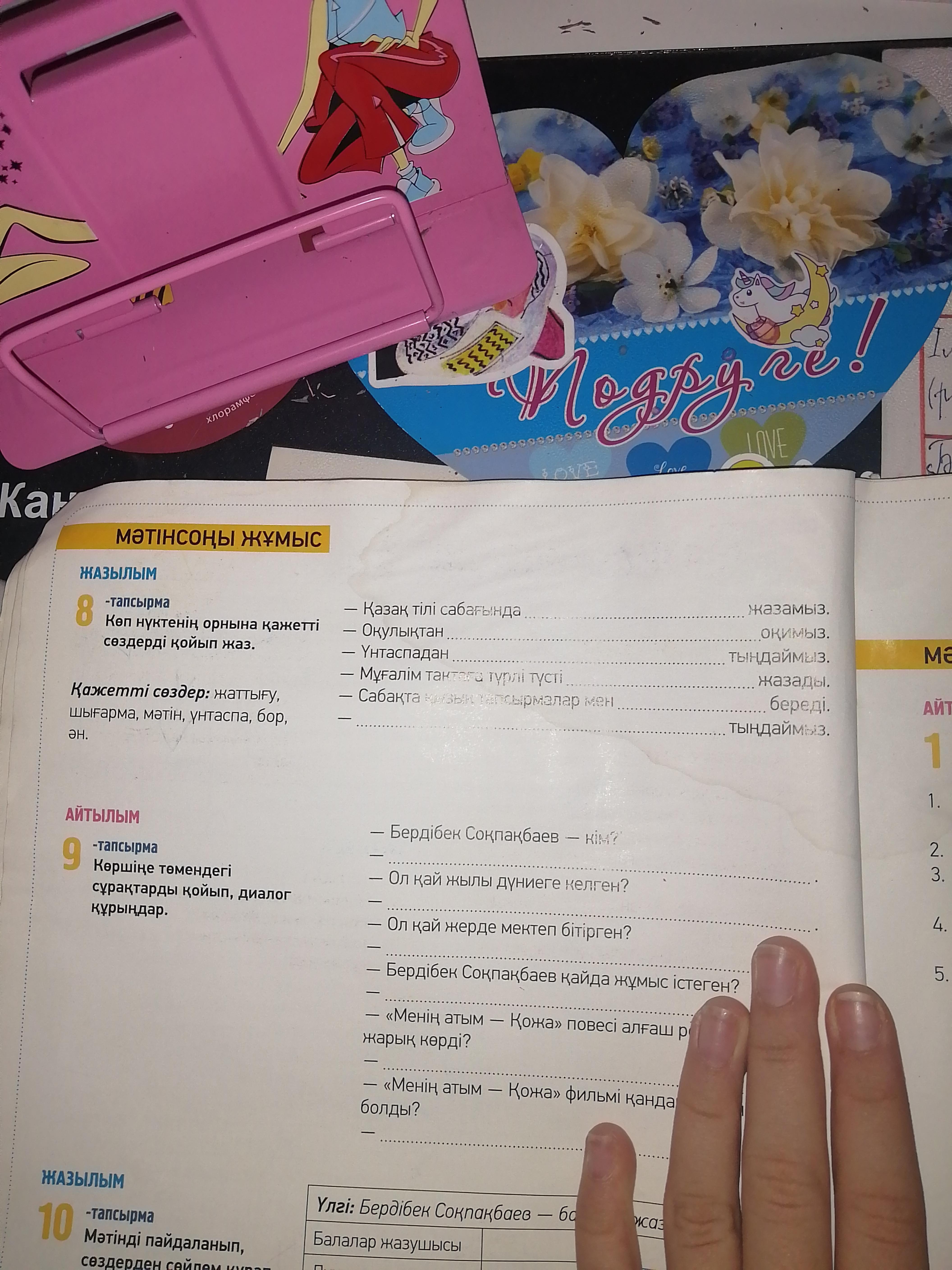 Көп күктенің орнына қажетті сөздерді қойып жаз. Қажетті сөздер: жаттығу, шығарма, мәтін, үн аспа, бор, ән.