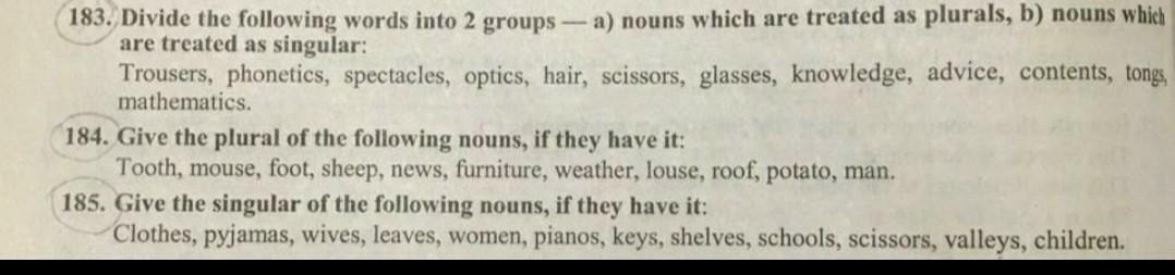 Clothes (always plural), pyjamas (alway plural), wives-wife, leaves-leaf, women-woman, pianos-piano, keys-key, shelves-shelf, schools-school, scissors(always plural) valleys-valley, children-child