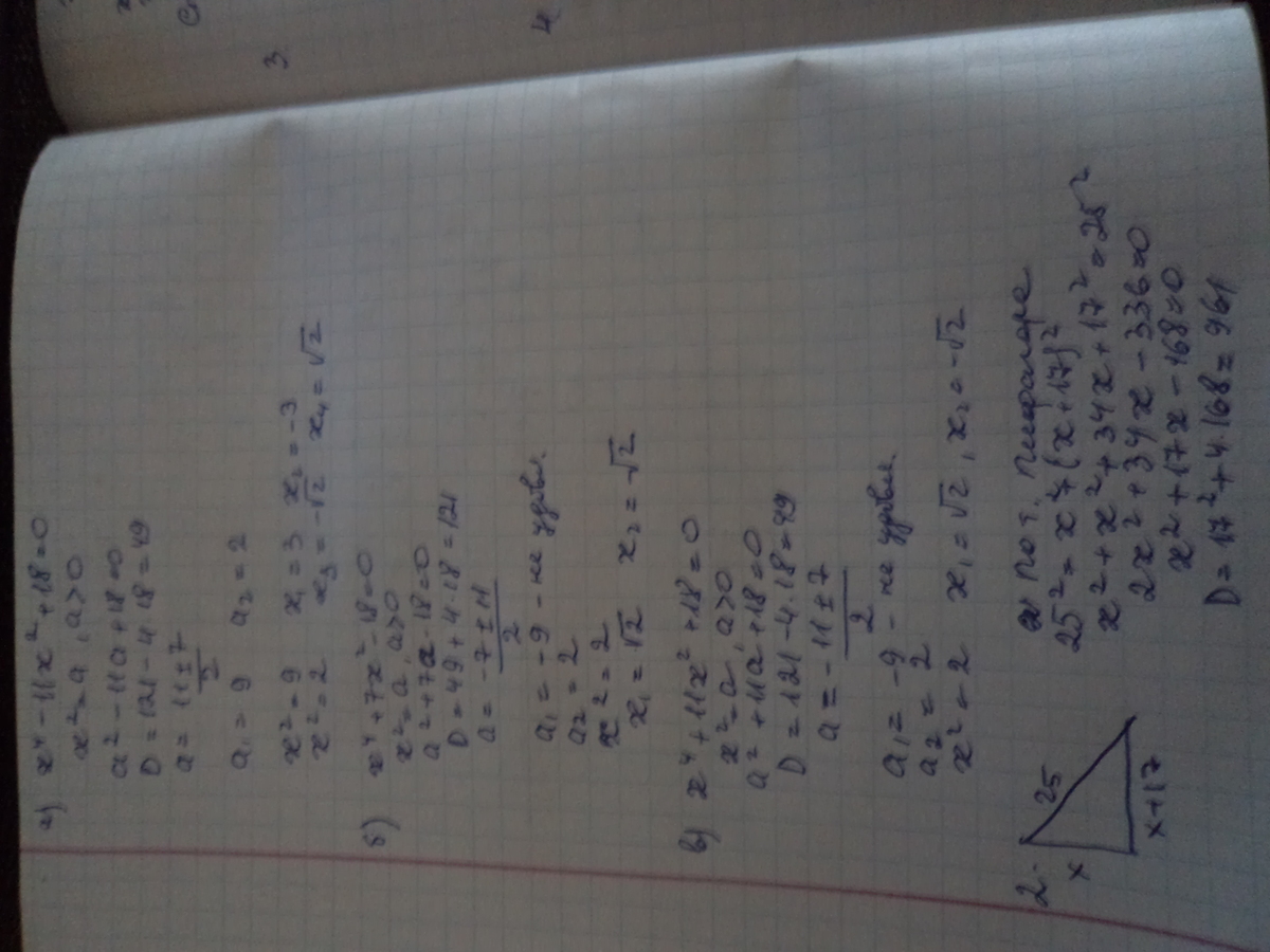 1.Решите биквадратное уравнение: а)1.Решите биквадратное уравнение: а) x^4-11x^2+18=0 ; б) x^4+7x^2-18=0 ; в) x^4+11x^2+18=0