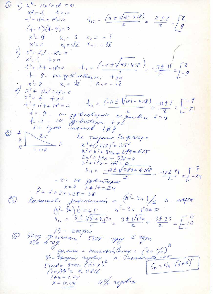 2. Найдите периметр прямоугольного треугольника, если его гипотенуза равна 25, а один из катетов на 17 больше другого. 3. Сколько сторон у многоугольника, если в нем можно провести 65 диагоналей? 4. Положив в банк 5000 р., вкладчик через два года получил 5408 р. Какой процент начислял банк ежегодно? 5. В координатной плоскости хОу построена трапеция ABCD. Вершины А и D лежат на оси абсцисс, а вершины В и С — на графике функции y =√x (точка А — проекция точки В, D — точки С на ось абсцисс). Найдите расстояние между точками А и D, если АВ = 2, а большая диагональ равна 4.