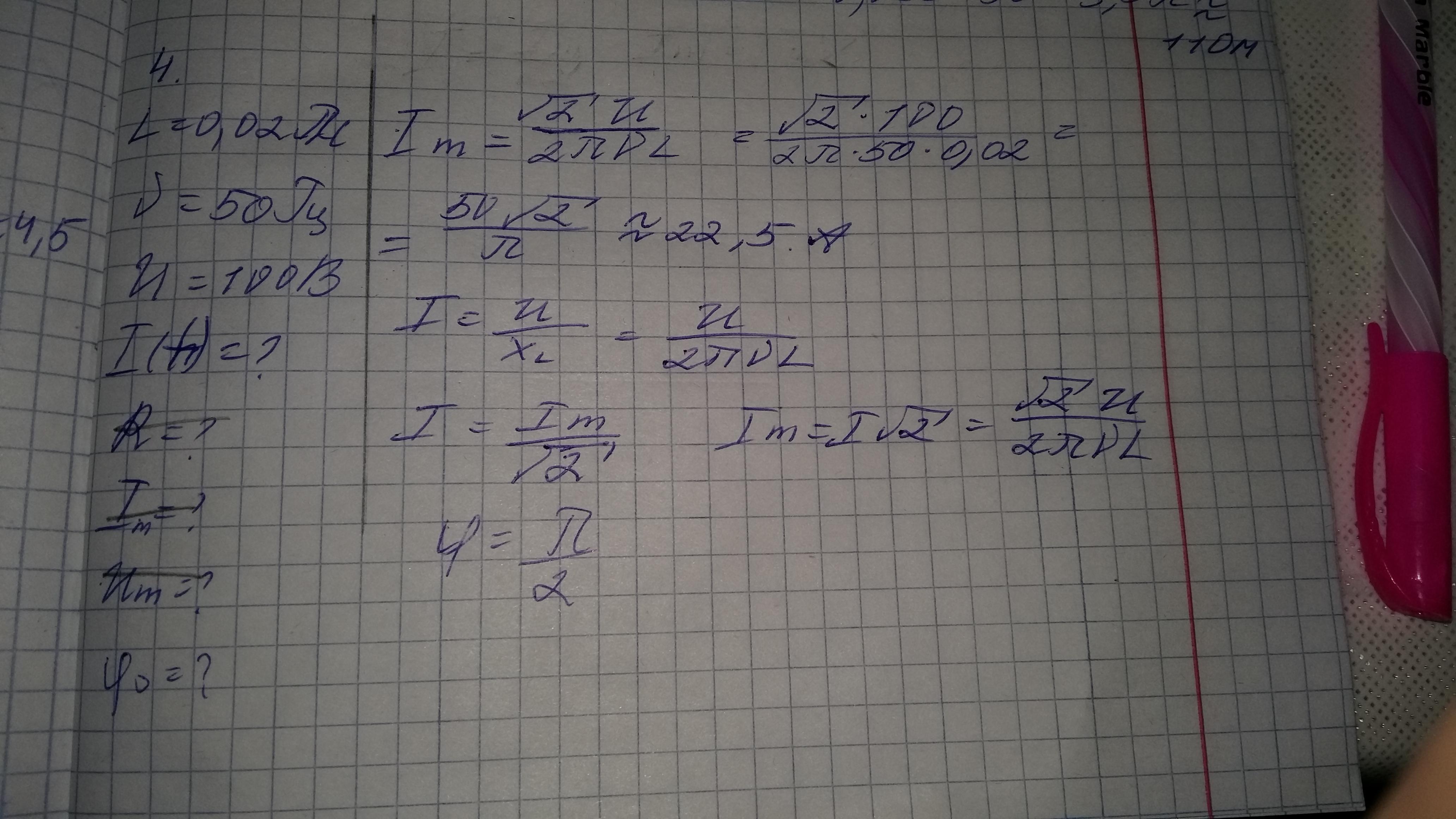 Катушка индуктивностью L = 0,02 Гн присоединена к источнику переменного напряжения частотой V = 50 Гц. Действующее значение напряжения U = 100 В. Определите зависимость мгновенного значения силы тока от времени и сдвиг фаз между током и напряжением. Активным сопротивлением катушки пренебречь.