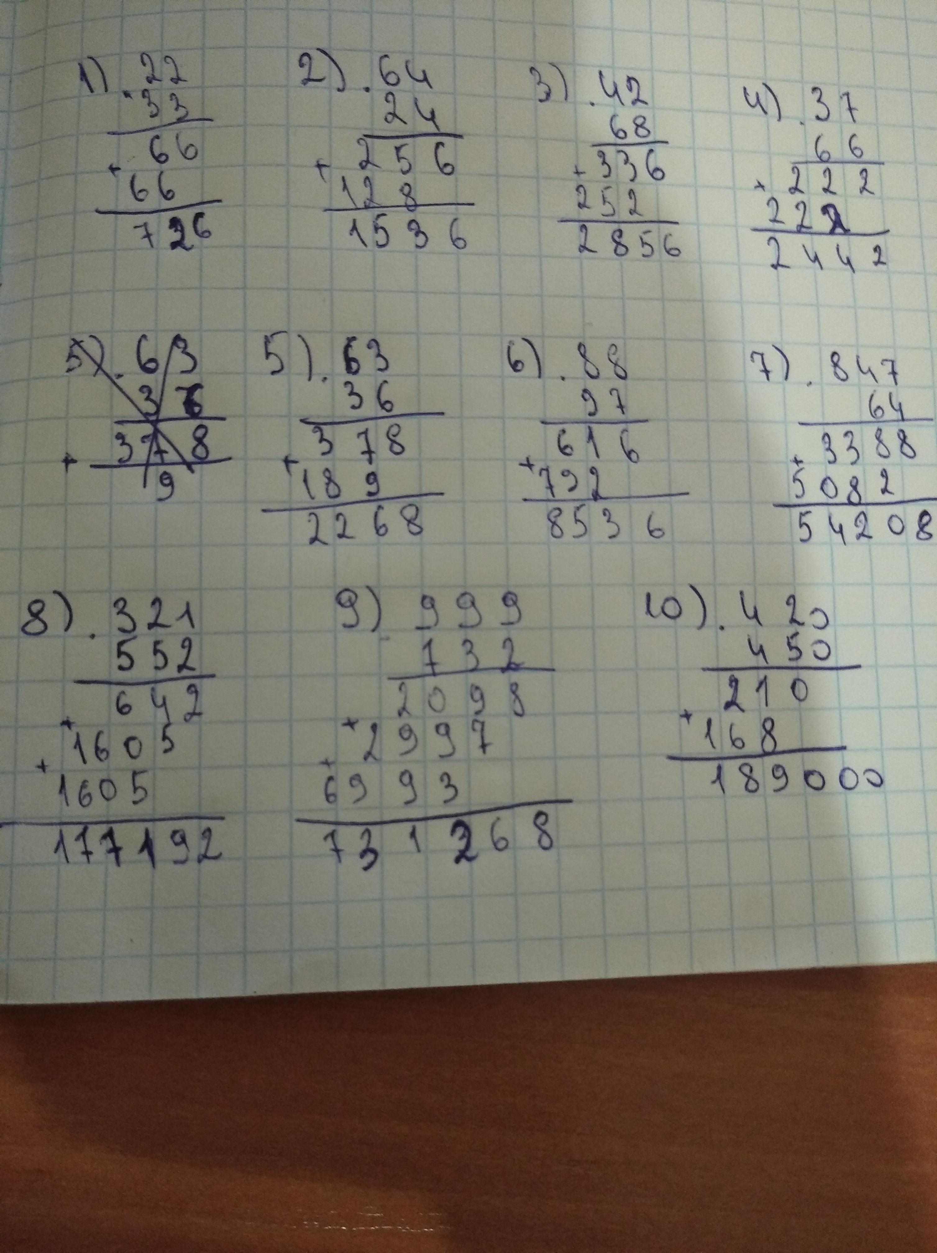 реши примеры в столбик 22 x 33 ,64 x 24,42 X 68,37 X 66,63 х 36,88 х97, 847 X64, 321 x552, 999 х 732,420 х 450,пожалуста срочнооо