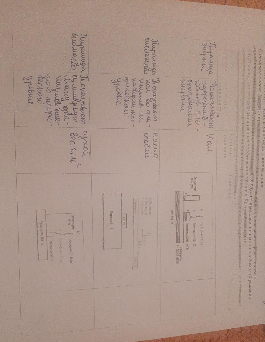 Задание Заполните таблицу, используя номера ключевых слов, Ключевые слова Кал(0); пирамида биомассы(1); Число особей(2); показывает эффективность преобразования энергии(3); пирамида численности(4); служит наиболее полным способом отображения связей между организмами на разных трофических уровнях(5); г/м3 (6); организмов каждом трофическом уровне(7); пирамида энергии(8); показывает суммарную массу организмов каждого трофического уровня (9). показывает Плотность на Название пирамиды Пирамида Особенности