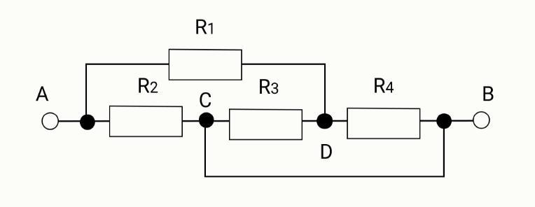 В схеме, представленной на рисунке, R1=R2=2 Ом, R3=R4=4 Ом, напряжение (UAB) между точками A и B составляет 6 В.