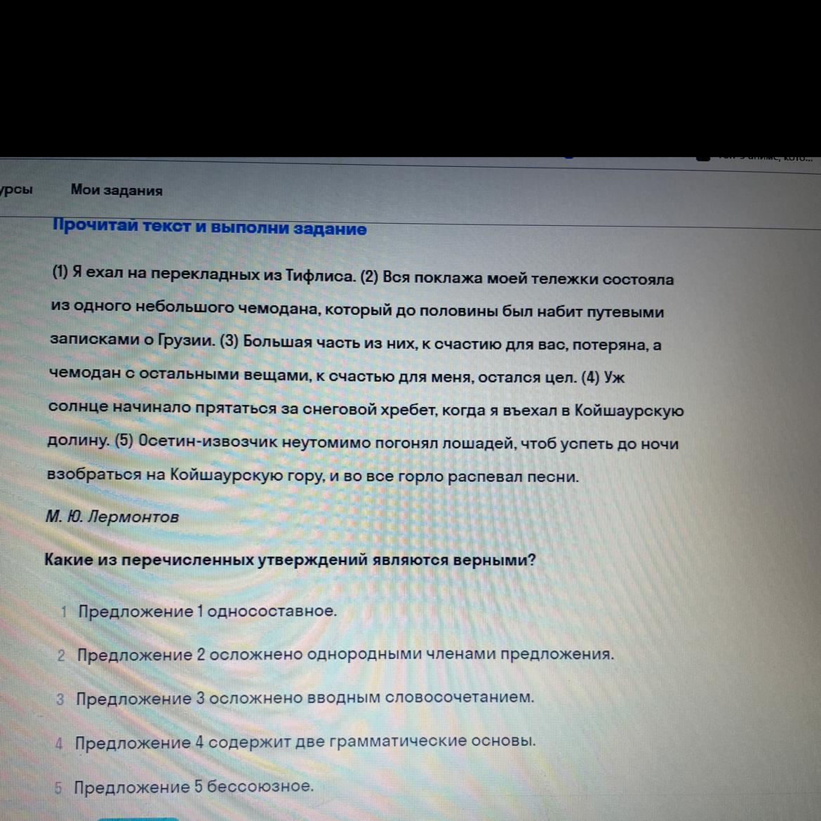 5. Предложение 5 бессоюзное - неверно (придаточная цели соединена союзом чтоб — [осетин-извозчик неутомимо гонял лошадей (зачем?), (чтоб успеть до ночи взобраться на Койшаурскую гору), и во всё горло распевал песни] )