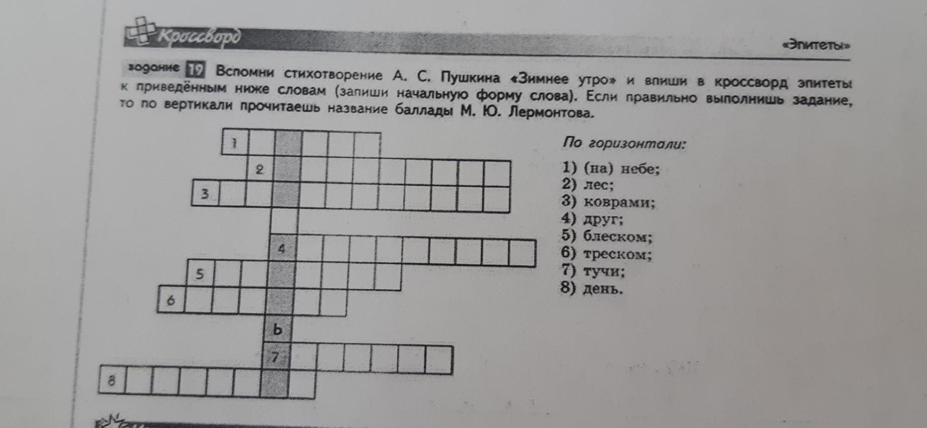 Кроссворд вороние 19 Вспомни стихотворение А. С. Пушкина «Зимнее утро» и впиши в кроссворд эпит к приведённым ниже словам (залиши начальную форму слова). Если правильно выполнишь задан то по вертикали прочитаешь название баллады М. Ю. Лермонтова. 1 2 3 По горизонтали: 1) (на) небе; 2) лес; 3) коврами; 4) друг; 5) блеском; 6) треском; 1) тучи; 8) день. 4 5 6 b 7 E «Ио- Игра ? Питай стихотворение А. С. Пушкина «На небесах печ