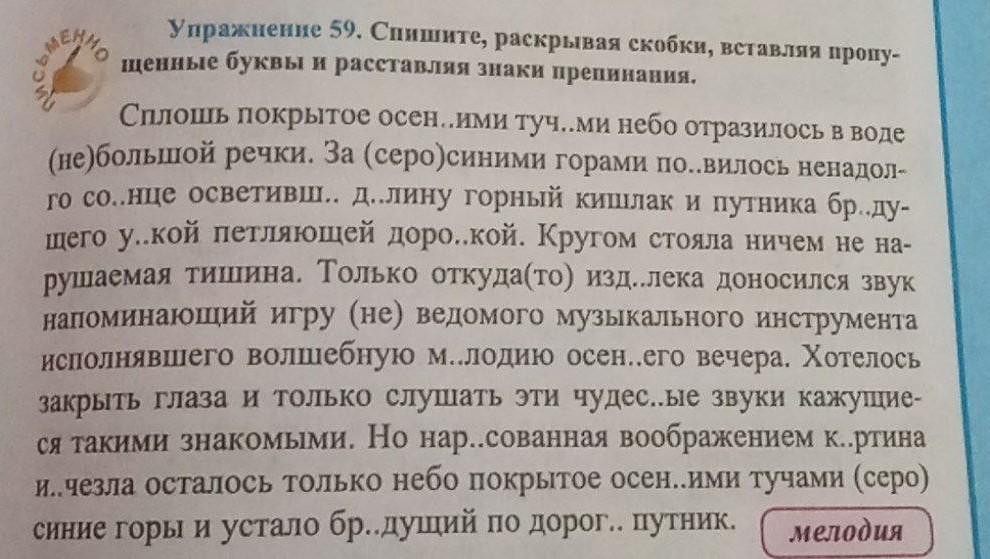 Сплошь покрытое осенНими тучАми небо отразилось в воде НЕбольшой речки. За СЕРО-синими горами поЯвилось ненадолго соЛнце, осветившЕЕ дОлину, горный кишлак и путника, брЕдущего уЗкой петляющей дороЖкой. Кругом стояла ничем не нарушаемая тишина. Только откуда-ТО издАлека доносился звук, напоминающий игру НЕведомого музыкального инструмента, исполнявшего волшебную мЕлодию осенНего вечера. Хотелось закрыть глаза и только слушать эти чудесНые звуки, кажущиеся такими знакомыми. Но нарИcованная воображением кАртина иСчезла, осталось только небо, покрытое осенНими тучами, СЕРО-синие горы и устало брЕдущий по дорогЕ путник.