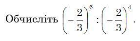Відповідь:(-2/3)6:(-2/3)4=(-2/3)2