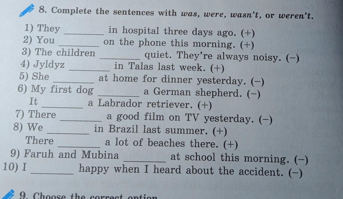 Все глаголы в прошедшем времени. Нужно верно определить число, множественное were или единственное was. Отрицательное предложение или нет видно в скобках после предложения.