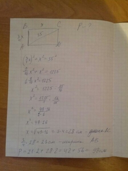 Диагональ прямоугольника равна 35 см.Найдите периметр прямоугольника если одна из его сторон составляет 3/4 другой