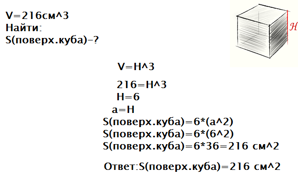 Объем куба равен Грань в кубе. Убираем куб. получаеся 6 см-одна сторона. Площадь поверхности куба (a^2)*6 -->216 см^2 .Вроде бы так