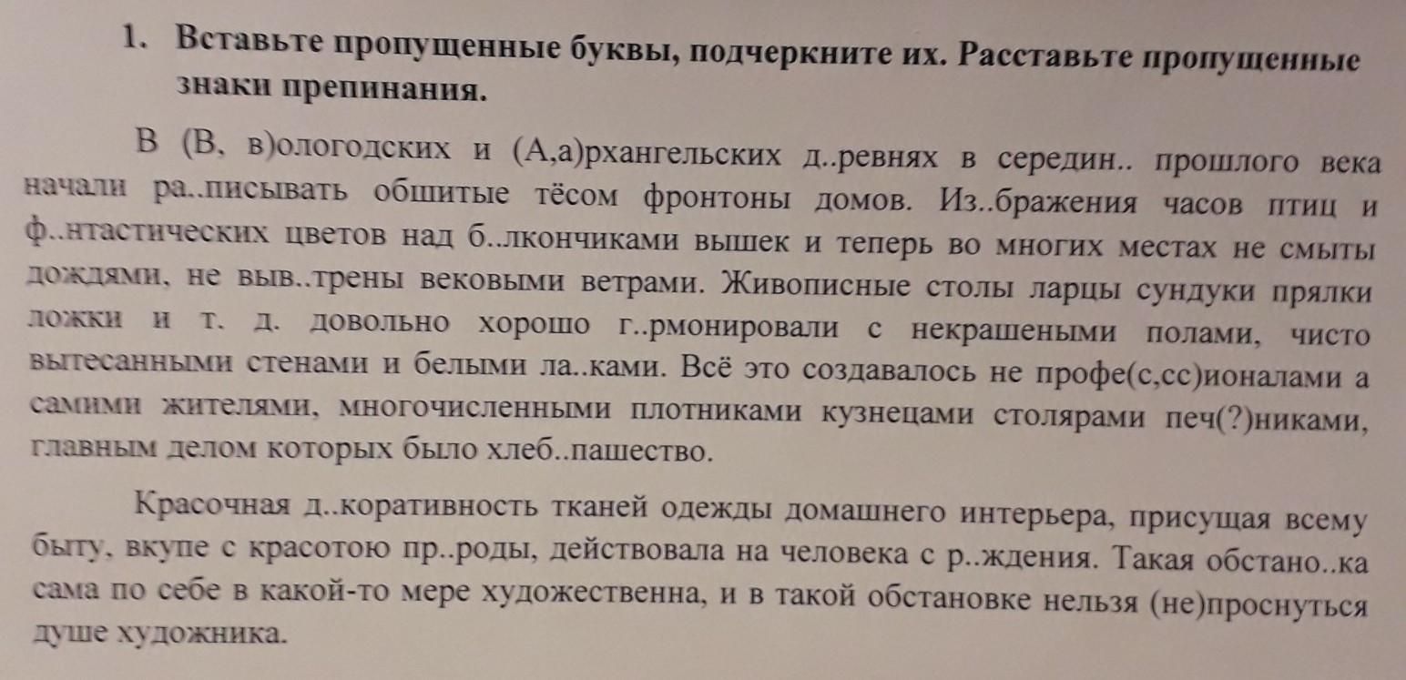 В Вологодских и Архангельских деревнях, в середине прошлого века, начали расписывать обшитые тëсом Фронтоны домов. Изображения часов, птиц и фантастических цветов над балкончиками вышек, и теперь во мНОГИХ местах ,не смыты дождями, не выветрены вековыми ветрами. Живописные столы, ларцы, сундуки, прялки, ложки и т. д. довольно хорошо гармонировали с некрашеными полами, чисто вытесанными стенами и белыми ларьками. Всё это создавалось не профессионалами, а самими жителями, многочисленными плотниками, кузнецами, столярами, печниками, главным делом которых было хлебопашество. Красочная декоративность тканей, одежды, домашнего интерьера, присущая всему быту, вкупе с красотою природы, действовала на человека с РОЖДЕНИЯ. Такая обстановка сама по себе в какой-то мере художественна, и в такой обста