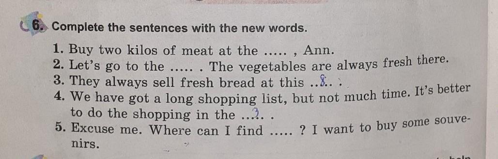 1-butcher's. 2-greengrocer's 3- Baker's 4- supermarket 5-Gift shop
