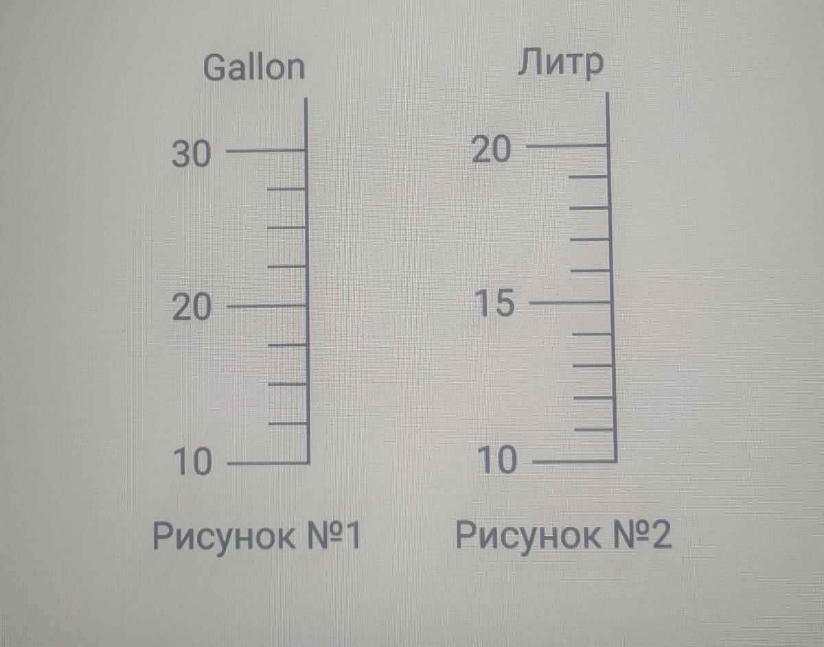 Робинзон Крузо, находясь на необитаемом острове, нашел две бочки и ведро, выброшенные волнами на берег острова. На внутренней стороне бочек нанесены шкалы для определения объема жидкости в них. В первой бочке нанесена шкала в галлонах (участок этой шкалы показан на рисунке №1), а во второй в литрах (участок этой шкалы показан на рисунке №2). Крузо переливал воду при помощи ведра из одной бочки в другую. Когда он зачерпывал ведро из второй бочки, то уровень воды убывал в ней на 10 делений. Зная, что 1 галлон равен 3.8 литра, помогите Крузо ответить на следующие вопросы: