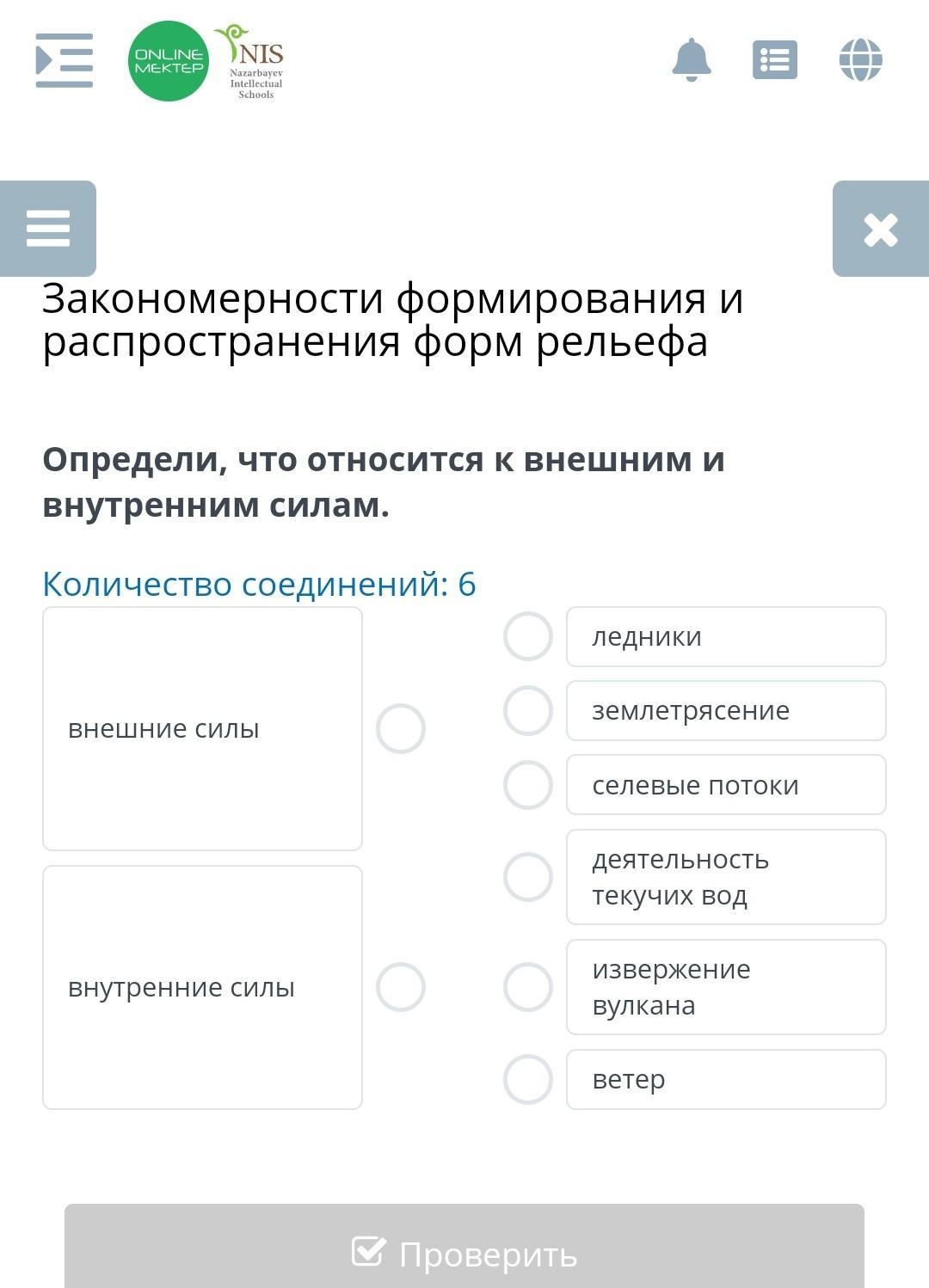 Внутренние силы- землетрясение, деятельность текущих вод, извержение вулкана!