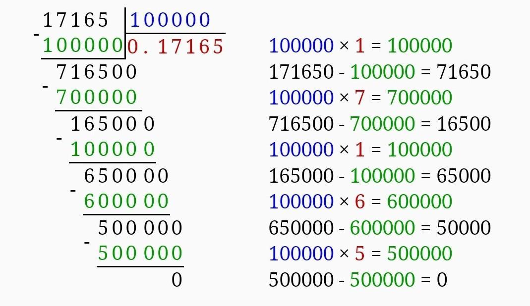 Для удобства вычислений преобразуем делимое и делитель в целые числа. Для этого умножим делимое 17,165 и делитель 100 на 1000. В результате наша задача сведется к делению следующих чисел: