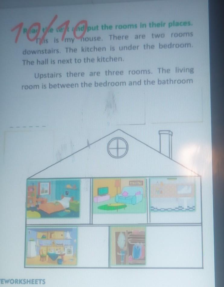 tele od put the rooms in their places. This is my nouse. There are two rooms downstairs. The kitchen is under the bedroom. The hall is next to the kitchen. Upstairs there are three rooms. The living room is between the bedroom and the bathroom