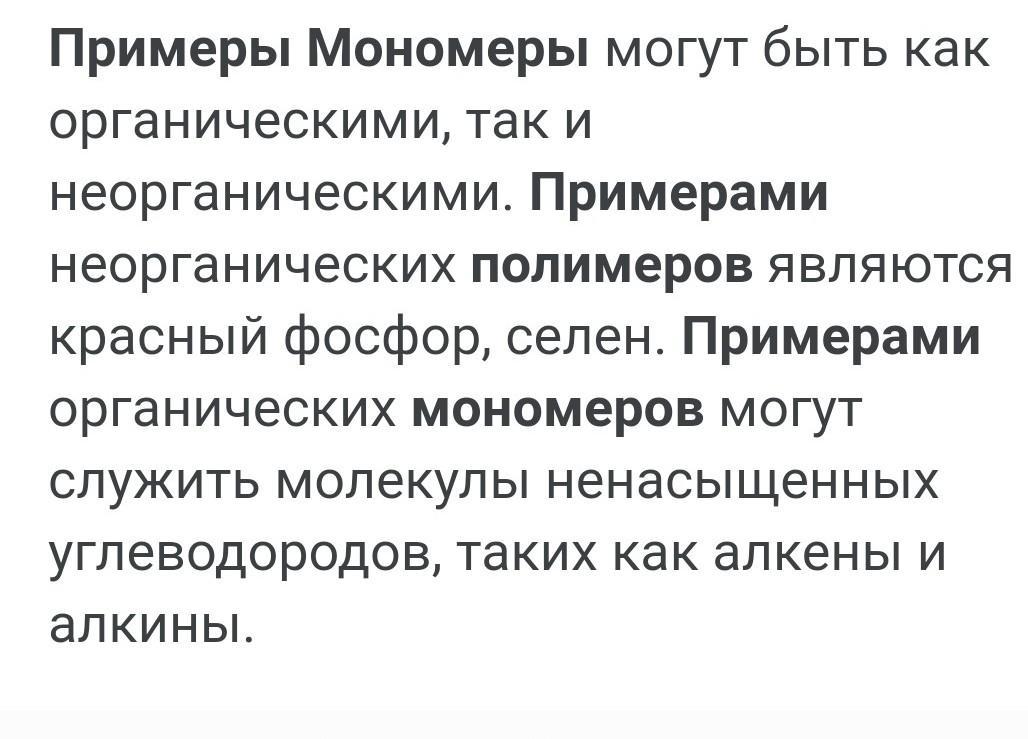 5)Примеры Мономеры могут быть как органическими, так и неорганическими. Примерами неорганических полимеров являются красный фосфор, селен. Примерами органических мономеров могут служить молекулы ненасыщенных углеводородов, таких как алкены и алкины.