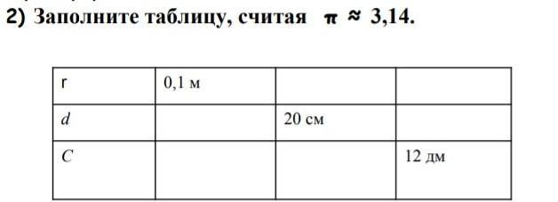 3 столбец: r = 6 дм ; d = 12 дм ; С = 37,68 дм